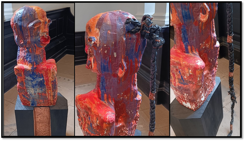 However, I do not think the bust on the altar-stage challenged. Their headpiece seems even more symbolically crucial if less showy but difficult to interpret outside folklore contexts that may be real or invented in either case. Look more closely at that ceramic bust below with closer perspective. It wears a single pigtail headpiece, tied in plaits and then knotted to the back of the head. He, she or they , wears their colour on their surface as we have already noticed, alternating between attempts at cooler blues that erupt too often into passionate red. They may, as I said, from the open mouth, blood-red with passion, be singing quite extrovertly. After all, they have placed themselves (been placed I know but let’s enjoy social play casting whilst we can) where they have on the central altar dais in order to be looking out to the entire room if they wish, though they have chosen those figures with more apparent social and bodily status.