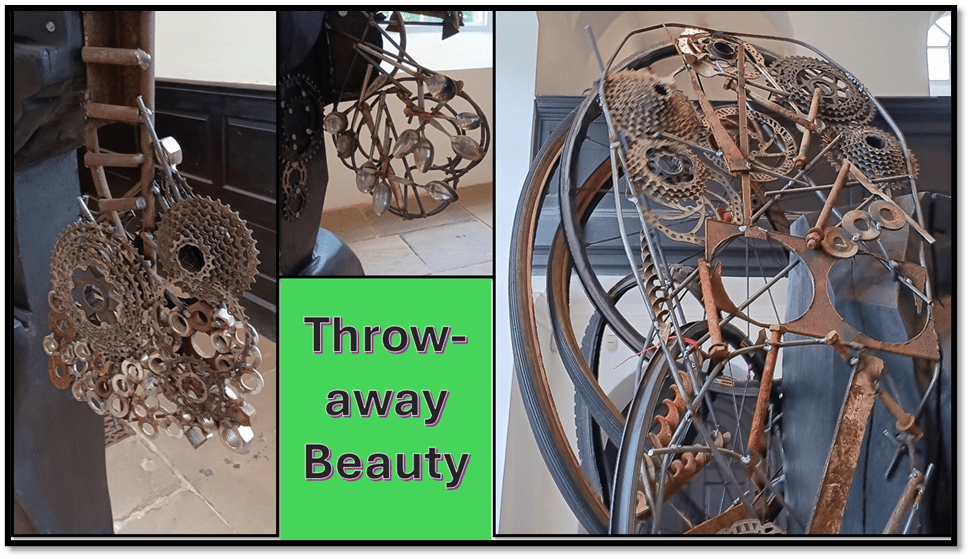 What is reinvented then is not only a once-proud pre-colonial Bugandan tradition, for most accounts show that homophobia was a colonial import, as were homophobic laws and a virulently homophobic Church of England in Africa, often directed at traditions of cross-dressing in early African clan experience associated with high value persons like shamans. Babirye is reinventing a new tradition but based on traditional craft expressions of spiritual value: ‘Babirye creates ceramic heads adorned with traditions like mask making and elaborate crowns, symbolising the enduring pride of her people’. Queer pride hence becomes something of national and communal pride derived from materials own ‘thrown-away’ and rejected but re-envisioned as ceremonial regalia. Let’s honour this recycling of value, what I call in the collage below: ‘Throw-away Beauty’.