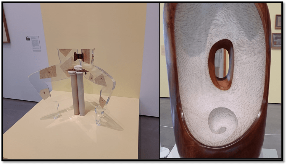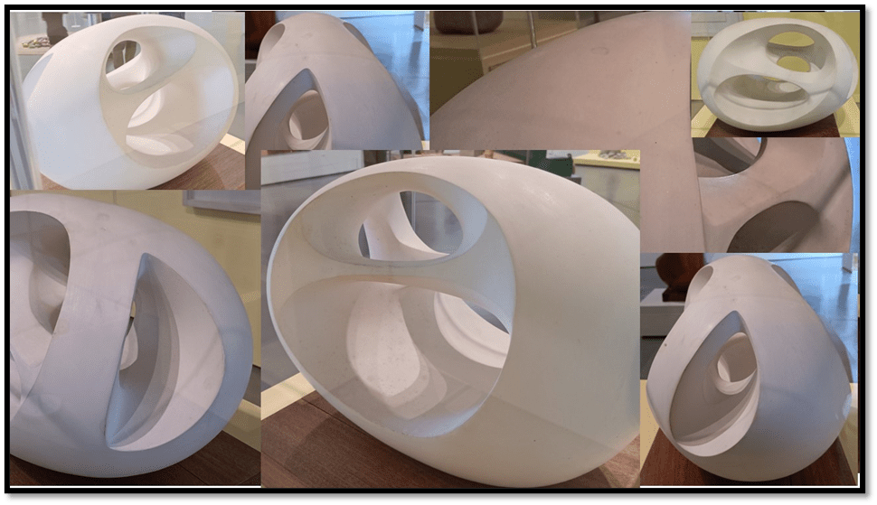 Of course the comparison is unfair but it strikes me as a useful one between a conceptual feminist art (on the left of the collage) and that of a deep feminism like that of Barbara Hepworth. Both comment on the fascination with the vagina and vulva as an image of woman, but the story told in the wide-open Perspex legs is too obvious, the point detracting from any pretence at art. We are left with cleverness alone: a woman saying, ‘Thus I differ from men’, and it typecasts me, it subjects me to misunderstanding. In Hepworth the forms are more universal but no less feminine both as mathematical or natural suggestions of fractals. There is no origin nor end to that beautiful work. As a man it shames me that I think I might understand the genesis of womanhood as a simple cultural construct and not one requiring vast revolution and spirals of change in the world od selves, objects and processes. In this she resembles Ron Moddy, but more on this much later.