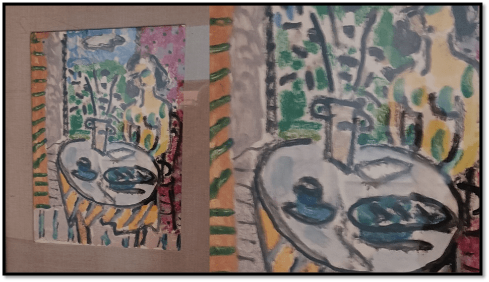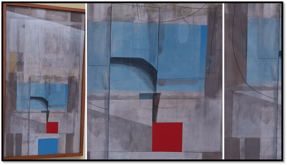 We might want to see only blocks of non-communicating colour in fixed formal design but we don’t (though not using non-reflective glass for a picture like this almost ruins its nuance) . Shapes and colours ghost each other even in thin impasto like this, as details show, and straight or regular curved lines get queered  being register by layering of shade, as well as colour.