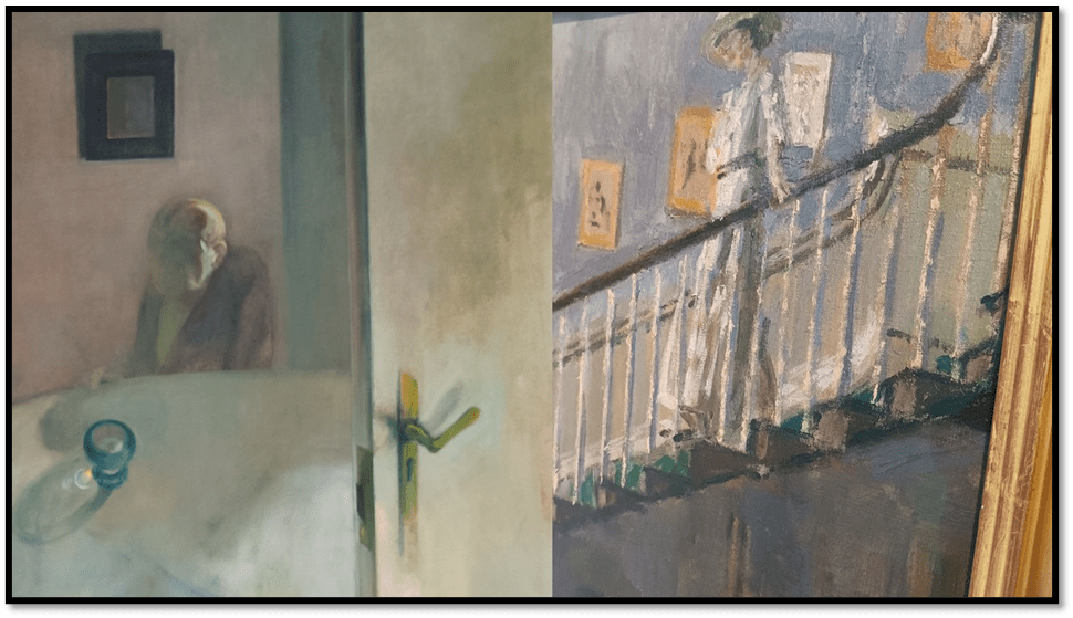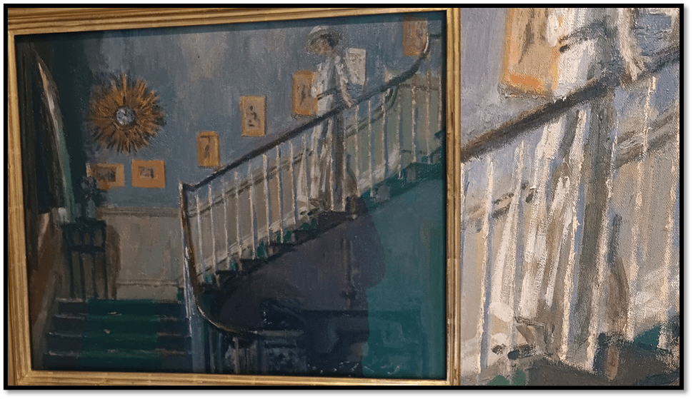 The effect of both motion and uncertainty is an effect of impasto that ‘derealises’ the vision in front of us. The foot descending the staircase is seen twice in front of sequential stair rails, the swirl of the printed dress too duplicates, the first swirl of the skirt of that dress, having behind it a gap through which we see the wall that ought to be behind the dress’s continuation upwards as its flow guides the body within it sown the stairs. It renders the figure not only full of motion but also a kind of queerness. Effects like this can only be achieved by layers of paint that do not pretend to show other than an appearance of things, but an appearance that yields no consistent impression and seems to express what is not otherwise expressible, something beyond ordinary perception.