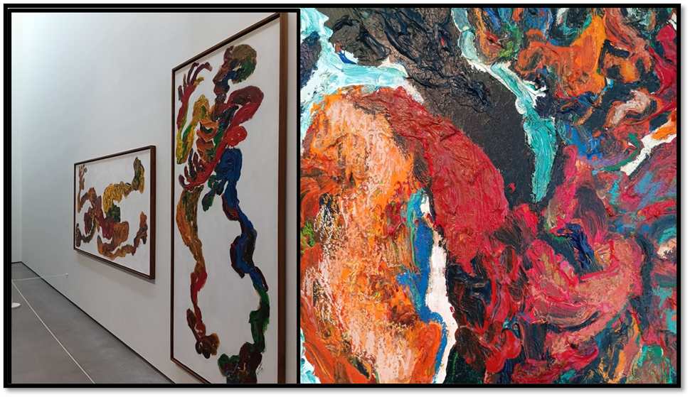 On this day trip, myself and my friend Catherine (for Geoff decided preferred to care for our dog Daisy at home) were aiming primarily for three exhibitions: a much belated culturally retrospective of Ronald Moody (blog still in preparation as Blog 6 of 6 of this series) and queer artists of colour: Igshaan Adams &  Leilah Babirye (blog 1 & blog 2   respectively) – although we saw Elisabethe Frink reprised too (blog 3) of this 6 blog series). The blogs are linked in the brackets before this sentence. Whilst at The Hepworth I was still relatively fresh and got a lot out of individual works, although I had intended to spend more time with an exhibition of oil painting by Sylvia Snowden. I did not feel energetic enough for this (so overwhelmed was I by Adams and to Moody in a quieter respect) but did learn from her.