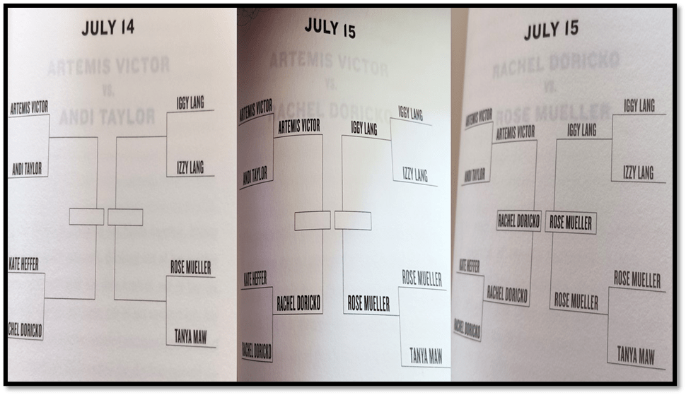 The schedules of the tournament held on July 14th and 15th 20XX of ‘The daughters of America cup’ (Women’s Under 18 & Under) at Bob’s Boxing Palace, Reno, NV as used to preface the Sections of this Novel based on the effects of the elimination rounds of the Tournament and culminating in the Final. BUT THERE IS MORE TO THE PLOT than that.