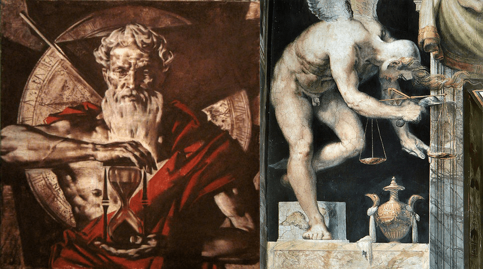 Kairos on the right is keen to pick up on any opportunity. He has one strand of hair on his head so the lucky abnd fortunate can grasp him. Chronos just watches time go by and people die successively.