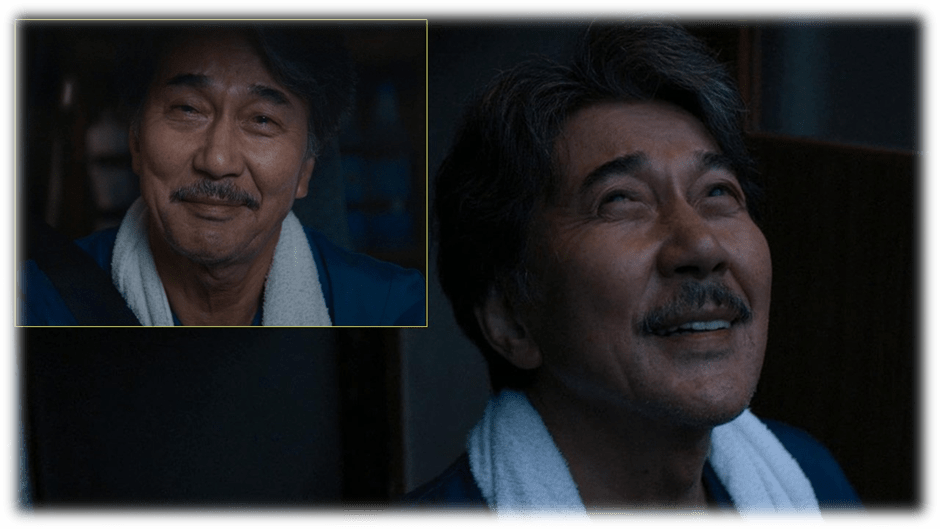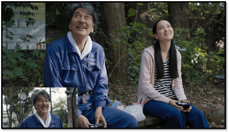 As we watch that sequence, at any moment, the actor’s face can be on the cusp of despair, actively melancholic or cheerfully breaking into the most beautiful of smiles that engages with something inwardly as if it were doing so outwardly in the public world – the way he actually does in the outside world with things, like the dawn, and people if anyone is attentive enough to him, which we feel the trees are. At the very end of the film, it is a sign that those who have learned how to attend to detail as Hirayama does, will be rewarded with the complexity in appearances that penetrates under surfaces and within the interior spaces of thought and feeling for find those complex cycles of intersecting feeling about the world that makes its contemplation significant. Below is one of the moments of transition worthy of study and full attention.