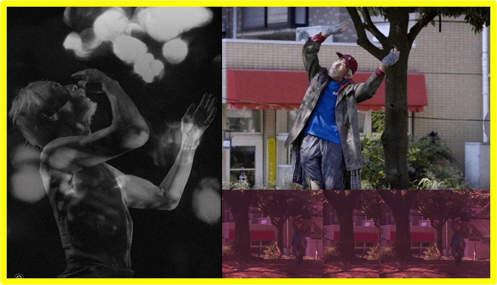 Min Tanaka in ‘Some Body Comes Into The Light’ (left) and (right) dancing in the city