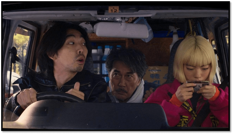 The latter drives with his hoped-for girlfriend (the one blonded with her nose in her phone) next to them and with Hirayama in- between, gazing at both and ahead while they talk about his taciturn nature, and the oddness of his working life. Takashi says Hirayama is good but odd in that he has set himself with a repertoire of his own equipment including the van for the same pittance as other toilet-cleaner team leads have. These questions matter in one way and not in another. What does matter is that we learn that Hirayama has invested in his simple life of service from supposed riches from his past. We learn all this from attending to the dramatic play of eyes between the three which happens simultaneously. He is is imagining their inner lives and everyone knows that. So thoroughly does he enter the imagination of others that his presence acts like an epiphany on the girlfriend, who returns a tape Takashi put in her bag to him (who had not realised it ‘lost’) and kisses him in thanks for being different to other men.