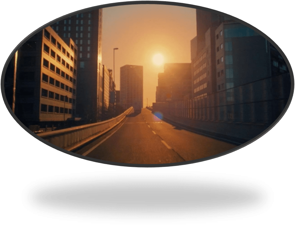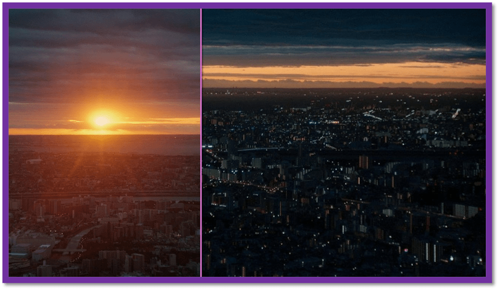 Imagine that and you get something like the beauty of the morning (left) and evening (right) shots over the city below in the collage – abstracted from the film where they are so much better objects of attention to light and reflection.