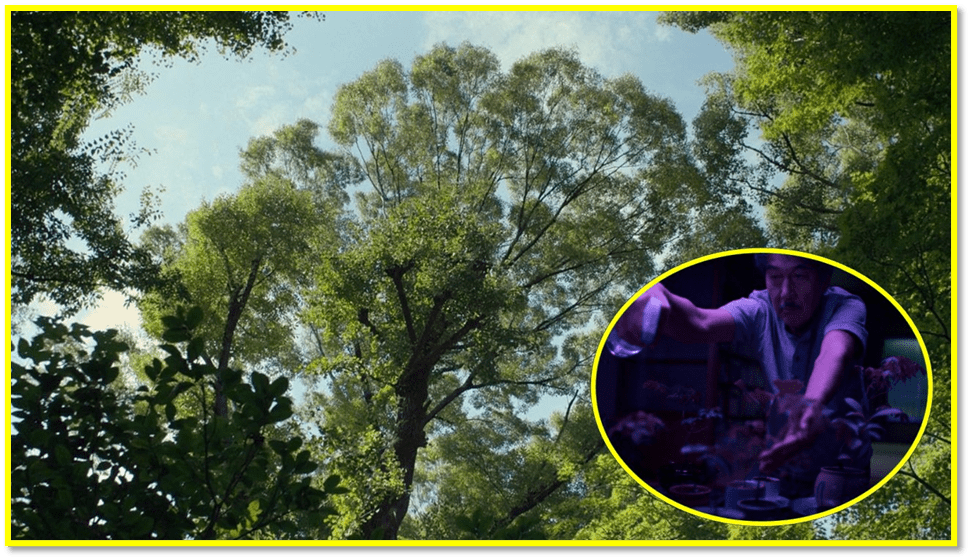 Hirayama’s ascetic existence is stripped back to basics: …; a point-and-shoot film camera with which he captures the things that please him; the interplay between the sky and the trees. Trees, it seems, have a particular significance for Hirayama, something that he pays back by carefully rescuing fragile Japanese maple seedlings in order to nurture them in his apartment.