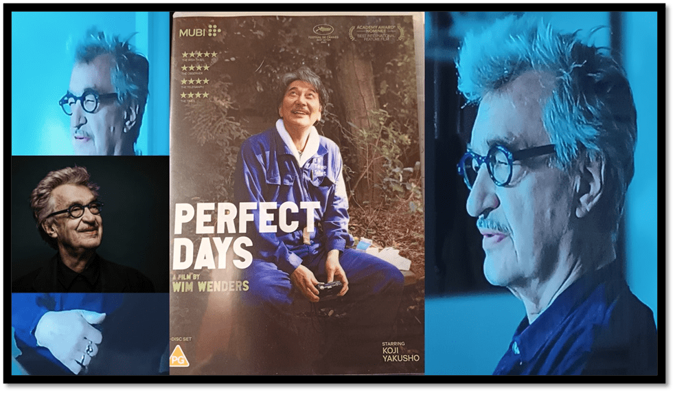 In interview available in the DVD version of this film, Wim Wenders says that ‘Too much story is a disaster’. That is because, as he suggests in an interview available with the recently published DVD, too obvious manipulation of plot interferes with the process of an audience being able to ‘enter into’ the filmic artists ‘propensity of seeing’. Wenders insists at the same time that art is about seeing ‘with a different kind of attention’ whether by the painter in visual art, by poets in words or by the filmic artist in the shared seeing and feeling of the dynamic interaction between images, sounds, words and rhythmic motion in movies. This blog is an attempt to understand what he might mean in relation to the film Perfect Days (2023), collaboratively produced with co-scripted by him and writer-director Takuma Takasaki and starring the wondrous Koji Yakusho.