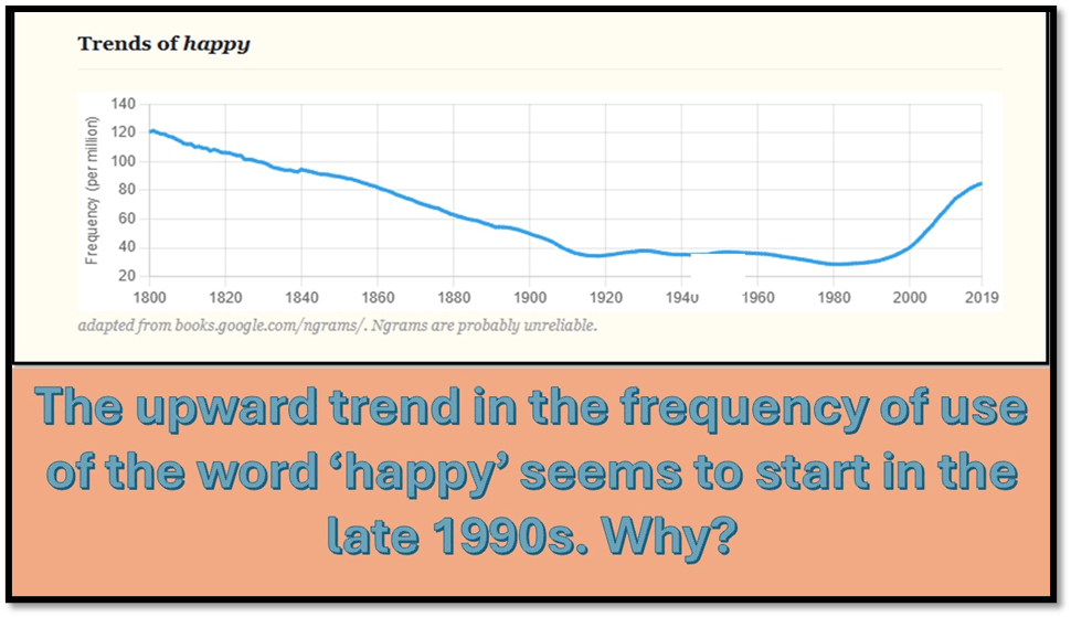 But that is another issue, and one I might take up when I blog later on Nott’s brilliant biography of how queer lives were constructed and reconstructed during the period of Gunn’s life. For now I want just to reflect on the word ‘happy’ and why there is an Anglo-American stress on it that produces prompt questions like this one, which promotes the responsibility of being, and if you can be, looking and acting happy. In the end, performance is all that is expected, although cognitive-behavioural and ‘positive’ psychology argues that if you ‘act happy’, there is no difference in effect, with constant practice thereof, from actually being happy. The word ‘happy’ rises in frequency of use in the 1990s in English corpuses of language use that are examined in Google ngrams. After that, it rises more sharply into the new millennium.