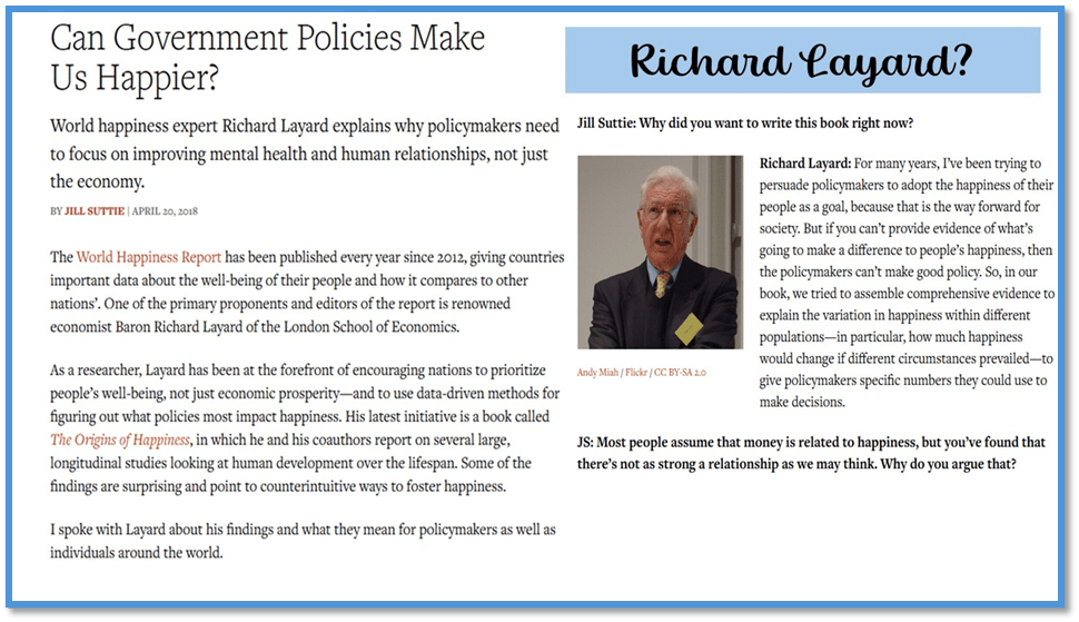 The NHS Plan of 2000 aimed to integrate services, especially at primary care level including early integrated interventions in physical and mental health care seen as a unit, and including young people. Never fully funded, it still implemented the role of Primary Care Mental Health Workers, of whom I was one of the first tranche trained in universities and in primary care in the theory and practice of increasing human well-being through trusted and tried therapies. For Layard, the aim always was the implementation of a plan for happiness not just based on physical and social change – in incomes, housing, or employment, although it included these initiatives. The aim was to increase human demand for happiness over material success as a goal. It was, if you like, the theory behind our prompt question – although now handed over to the private sector and informal structures for increasing well-being. Government took a back-step after later, right-wing, governments began to boast that the happiness of the many was no concern of theirs, ‘happiness’ being a private thing..