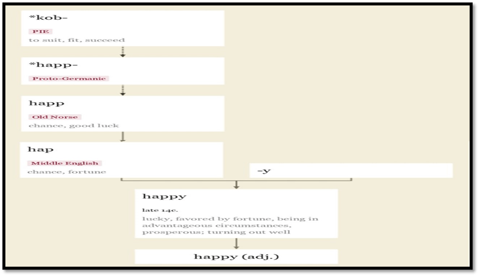 The text from the same source is as follows, attributing the English etymology to borrowinngs from other languages and only adding the fact that ‘haps’ meant good things, things that make you ‘happy’ in the late 14th century (1300s) and only surely so in the sixteenth century (1500s). The old English term was the root of our modern archaism, ‘blithe’ – from bliðe – as in Shelley‘s poem “To a Skylark“, (“Hail to thee, blithe Spirit! / Bird thou never wert“).