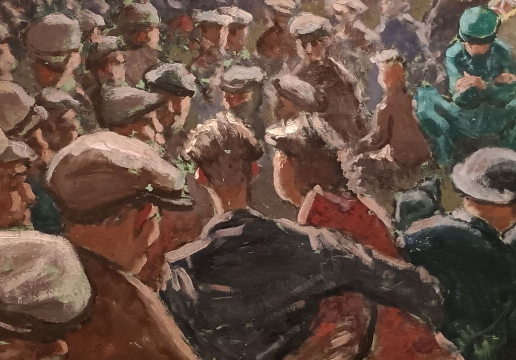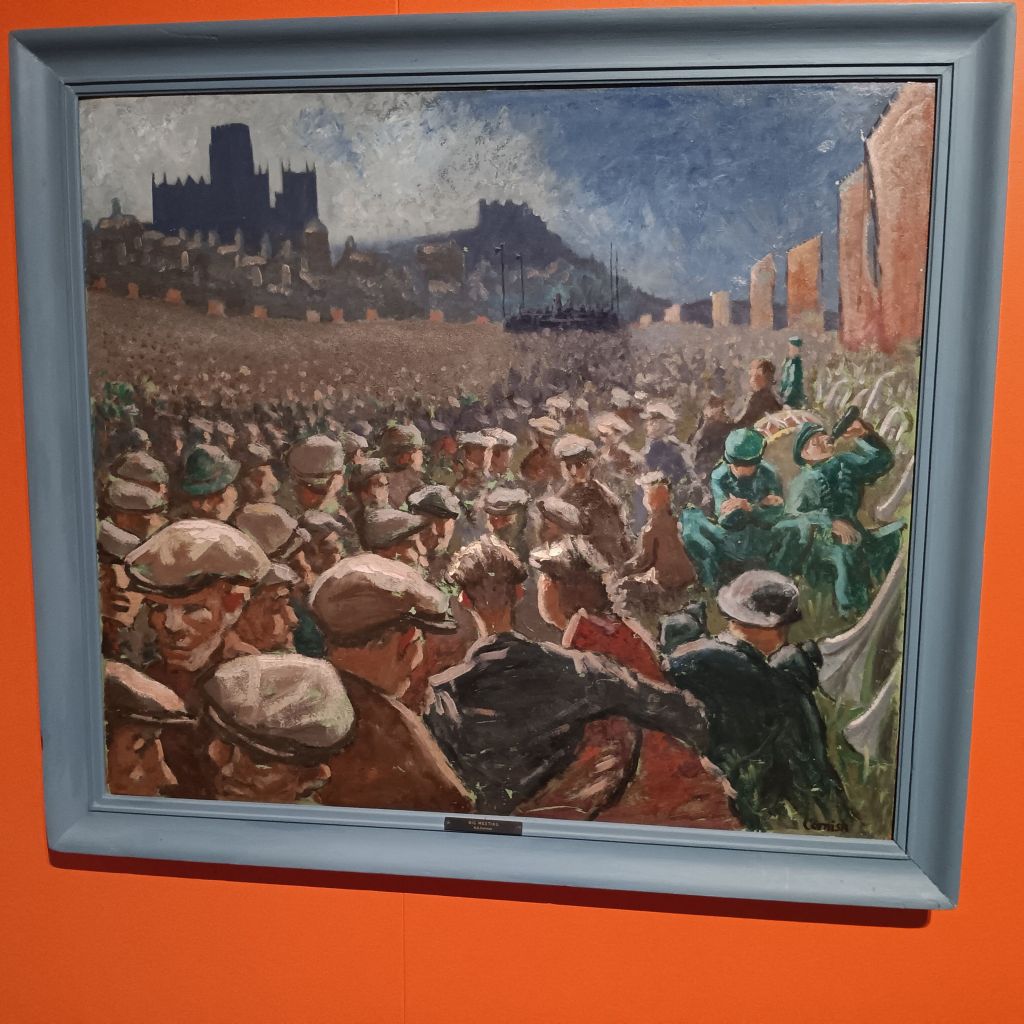 This is not a Cornish painting, I knew (it is in private hands), although it contains elements I knew, notably those Spennymoor miners in flat caps in tje foregroundspeaking together as they might in the many pubs full of them he drew and painted. What is new to me is the impossibly long perspective by which the masses attending Durham’s ‘Big Meeting ‘, the name local miners gave to the annual Miners’ Gala. There is a corridor here filled by the many that extends to an almost romanticised elevation in the background of the Durham Castle and the Cathedral.