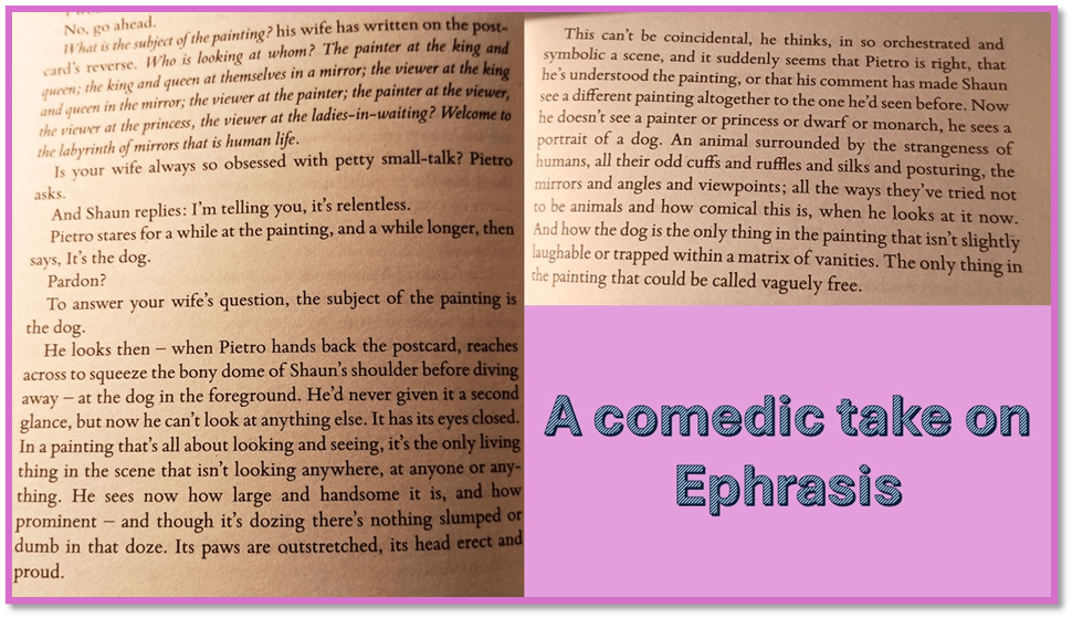 But Pietro puts us right, only for Shaun to widen the ekphrastic value of concentrating on this dog and its gaze, in contrast to the gaze of the humans that is the subject of Foucault’s ekphrasis of the painting in his opening to the work The Order of Things. What Shaun sees and justifies seeing is: