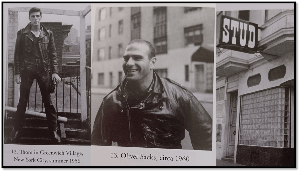 Whether a problem or no, it was an important one in the period of Gunn’s posing as a leatherman. It needs looking at too in the considerably complex life-case of the neurologist Oliver Sacks who also, and with Gunn in the flesh, pursued male leather / biker fantasies. Nott tells us Gunn describes Sacks on their first meetings (Sacks being merely a student) as ‘a queer, colossally big London Jew called Wolf … who says my poetry changed his life’. What Gunn liked was the masculinity (see collage below) but when Sacks began ‘to want me far too much’ after Gunn had sex with him, Gunn quickly dropped him, seeing him as ‘obsessive’.[13]