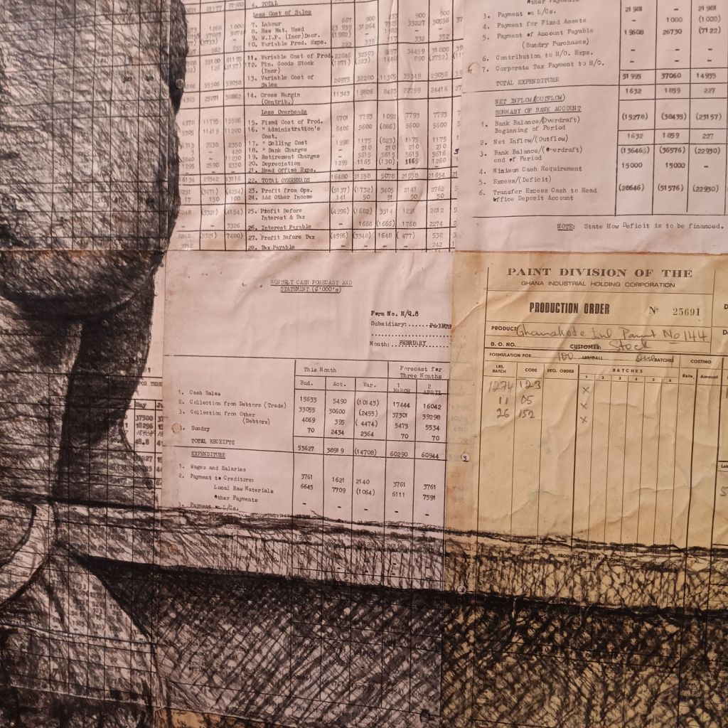 Other art is created by collaged bills and administrative paperwork salvaged from a manufacturer of paints for industrial purposes.