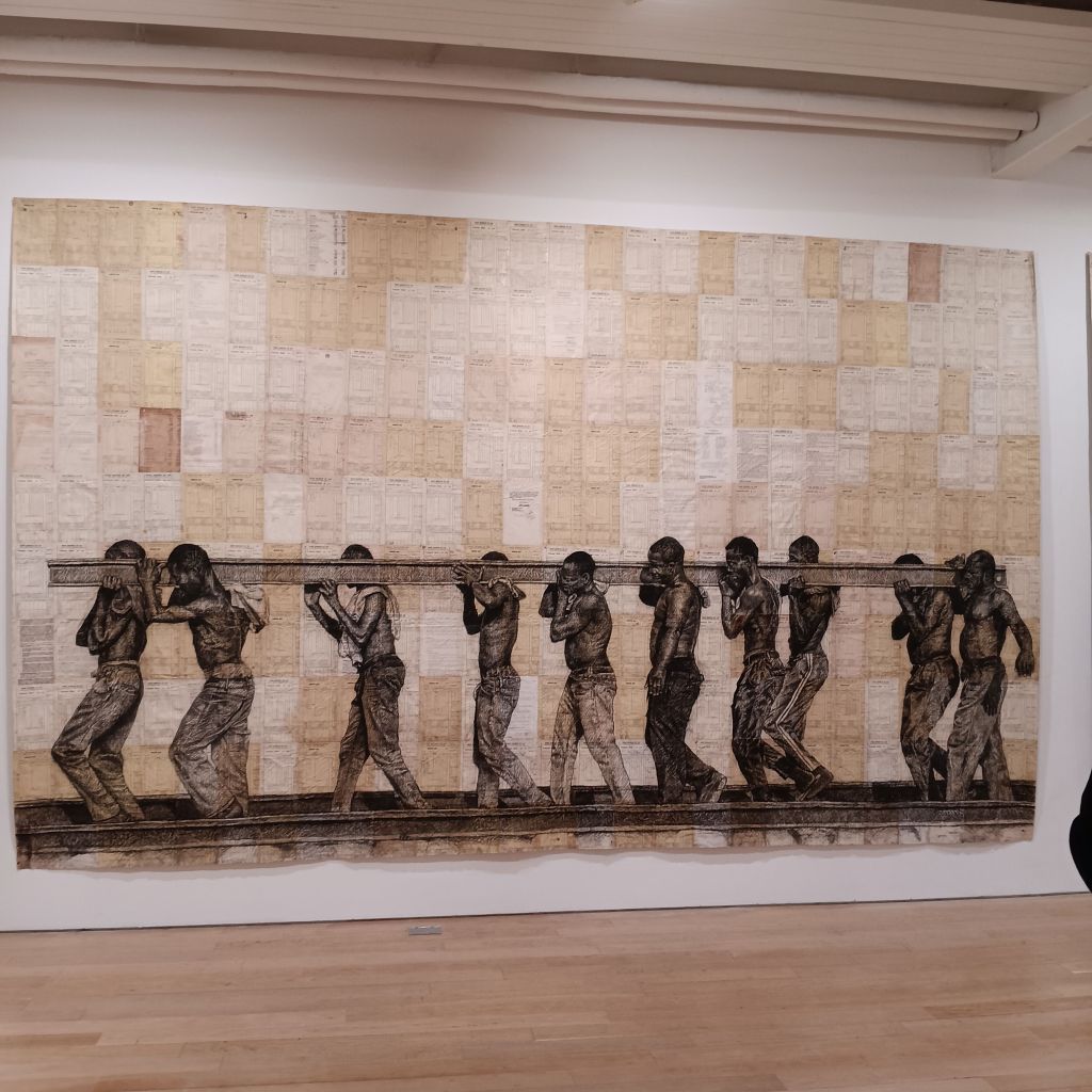 Created into huge surfaces whose text and / or calculations on bills of sale become visible only as marks, they are marked upon or branded again with figures somewhere between realistic labourers and idealised bodies or a mix of both and other symbols or patterns of marks. The variety is amazing.