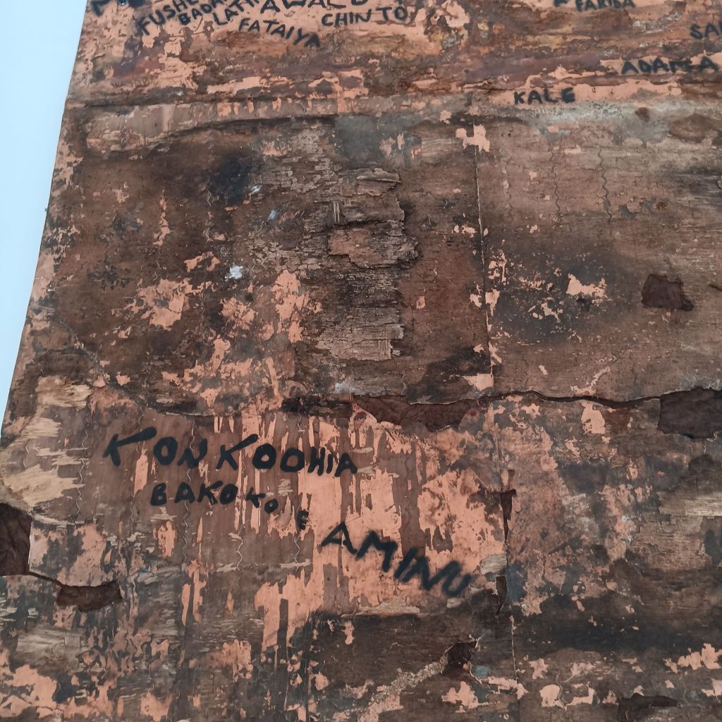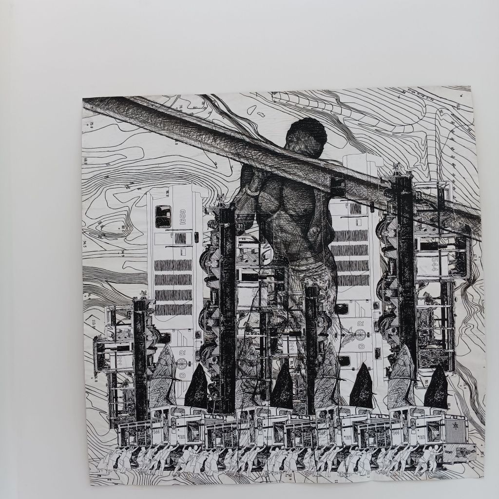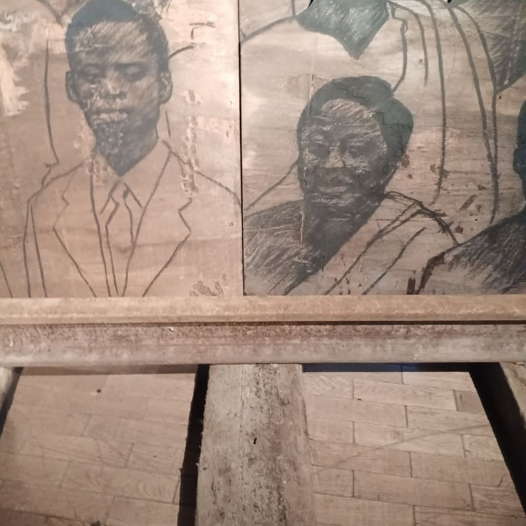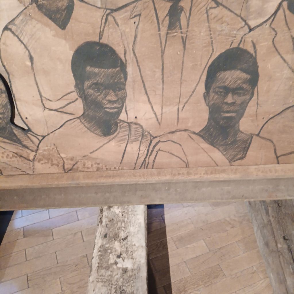 I was struggling with the meaning of the title of the exhibition for an exhibition filled with the lavour in particular of hefty men involved in the construction of the British commissioned railway developing the economy of the Gold Coast, an initiative that failed. Heavy with reference to slavery histories associated with the castles of no return on the coast, it was about colonialism and the very materials of his art that once serviced the commodification of ‘things’, even the jute sacks sown by female labour for storing peoduce, charcoals used in branding slaves or marking non-human goods including the leather skins rescued from the railway carriage wrecks, they decorated in their life.