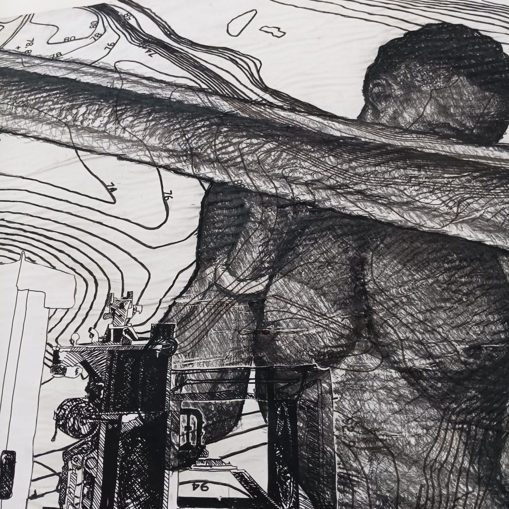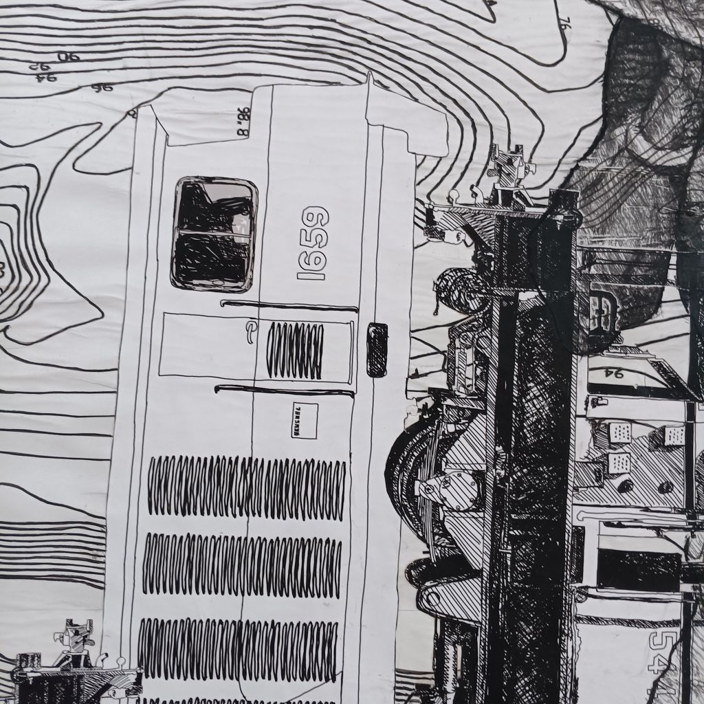 The markings are those of cartography showing contour lines next to created volumes of an artist’s figural representation of a body in its volumes, densities and inward and outward curves; curves that are created to deceive the eye. Likewise, iconic two dimensional.pictures of train stock created another level .of the representation of the ‘real’.