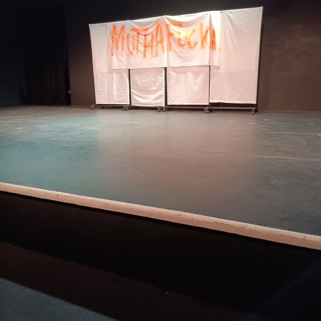 As you might suspect the word ‘MUTHAFUCKA is written on Oedipus’s garage door after his mistake is discovered by some funny neighbours but the representation of all this has to be done by some rather impromptu sets: