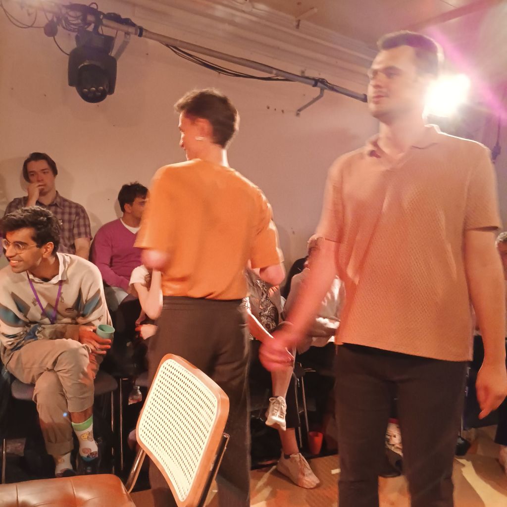 But it also includes their lives. Gab [left below], an Italian who come to London to study but whose queerness was still treated as a secret by his family and beloved brother. And Sam [right], his housemate and companion. Their coming out they attribute to the legacy of politicalicisation by the LSE Gay Liberation Movement. All of this interweaves into the conceptual, emotional and sense level of the play we experienced.