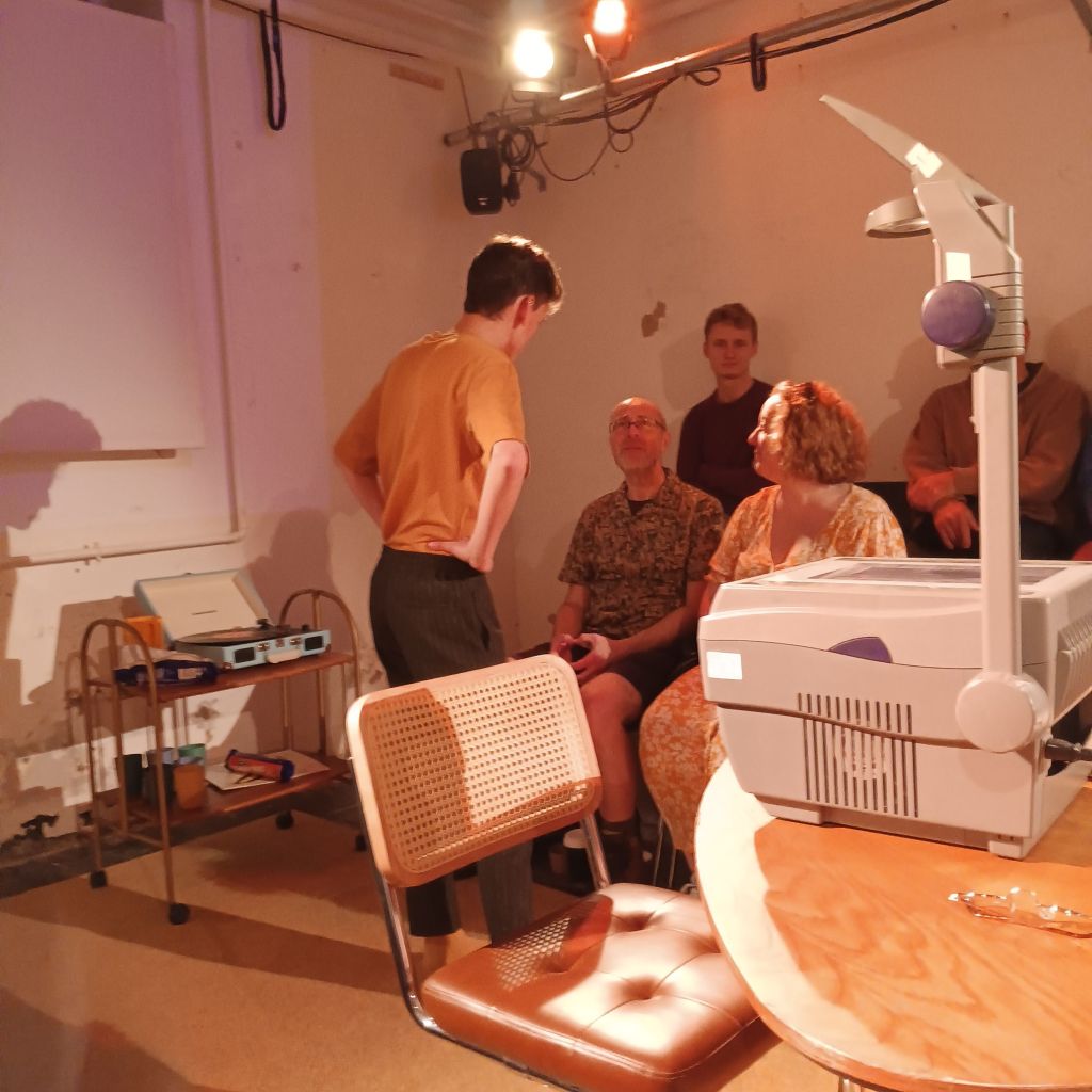 The claustrophobic space of the underground locker room was made evident with its temperature record [17 degrees] heightened by an audience of 37, we know both tjese things because that numeration (visibly collected by Gab in a head count) was projected from marked acetate written by Sam in situ and shown on an overhead projector that reeked of academia in the 1970s, even in the deliberate poor quality of the reproductions of old photographs of LSE. Though there were good visuals; of the modern LSE spiral staircase library of modern times, for instance.