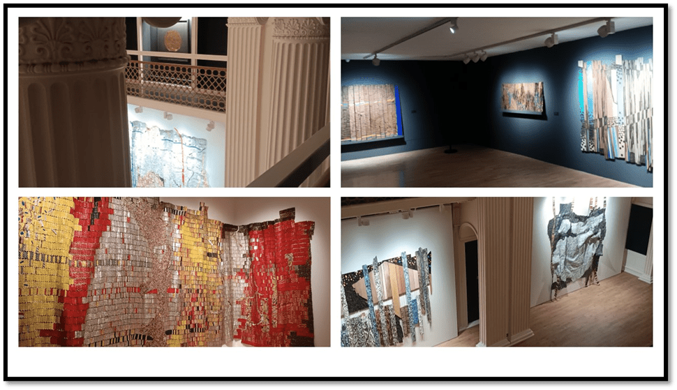 I don’t then intend to talk about these works here, but to show above their appearance in situ in the Adam interior that is the main room with its upper viewing gallery of smaller but magical works in circles of metal form. I can’t show the range, although above you see the wood relief sculptures that gave way to the use of industrial and retail waste. It uses specially some from the ‘trade’ alcohol exchange implicated even in slavery as well as enslavement of masses of people through substances that are addictive (the Empire knew how to do this in other places than china after all and with other substances than opium).