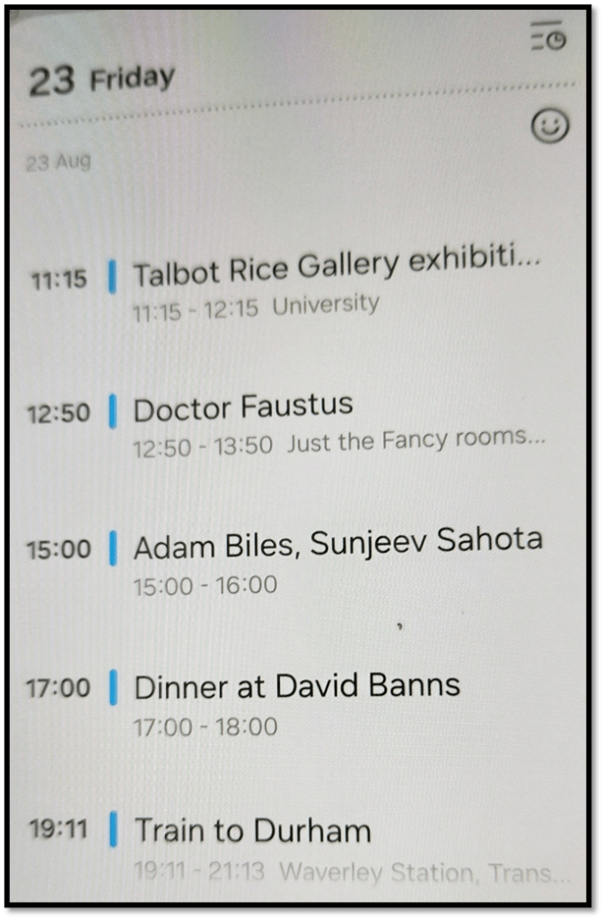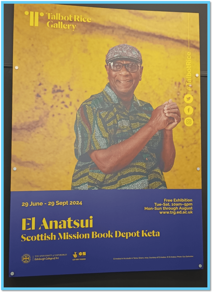 A resumé of the day is in my phone calendar below. This account picks up on each event briefly or otherwise but in the case of the exhibition of the work of El Anatsui exhibited at the Talbot Rice is as brief as a token requires, for I want to write on the artist separately, having now acquired Susan Mullin Vogel’s (2020) book El Anatsui: Art and Life, London & New York, Prestel Verlag.