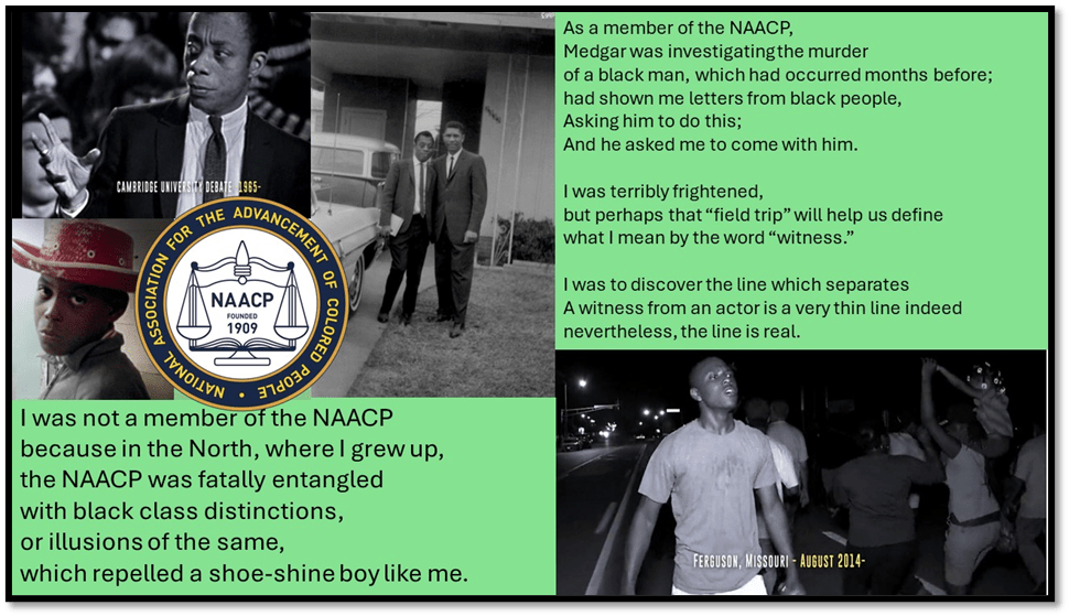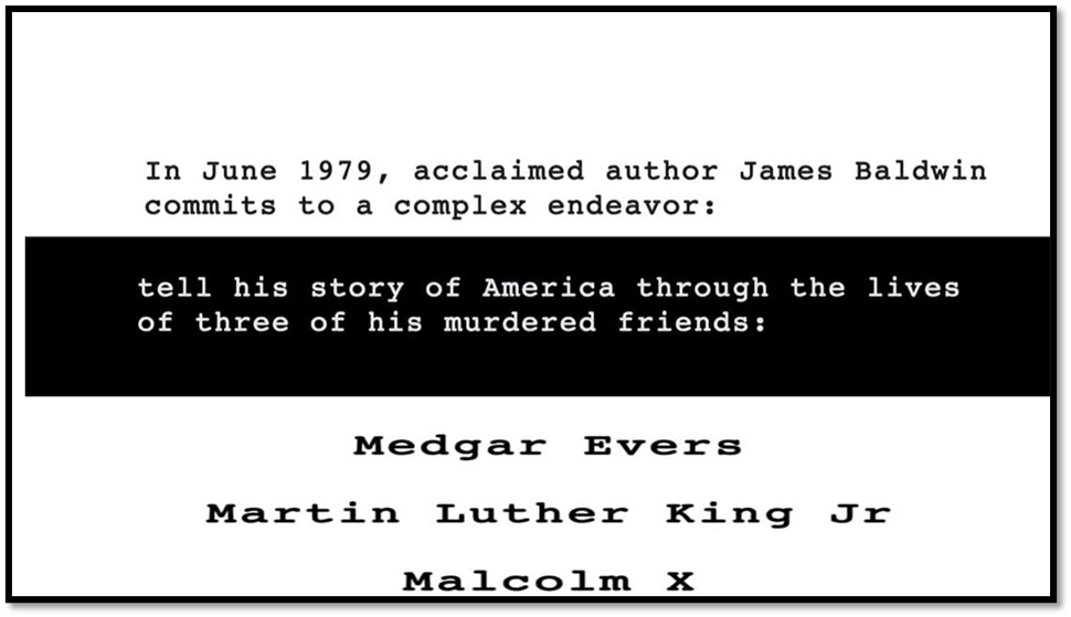All of this needs separate reflective discussion in another blog. But the book did raise an issue for me. I have been waiting to watch, for to my shame I have not seen it, Raoul Peck’s acclaimed film I Am Not Your Negro, based on an unfinished 30-page manuscript of Baldwin’s found at his death, and entitled Notes Towards Remember This House. Remember This House got no further than these notes and required revision by Peck, and editing by Alexandra Strauss, both of whom provide fascinating accounts of their process and how Baldwin’s practice as a writer justified it in the published text (with stills from the film) of the screenplay [1]. It’s purpose is summarised in captions from the film below: