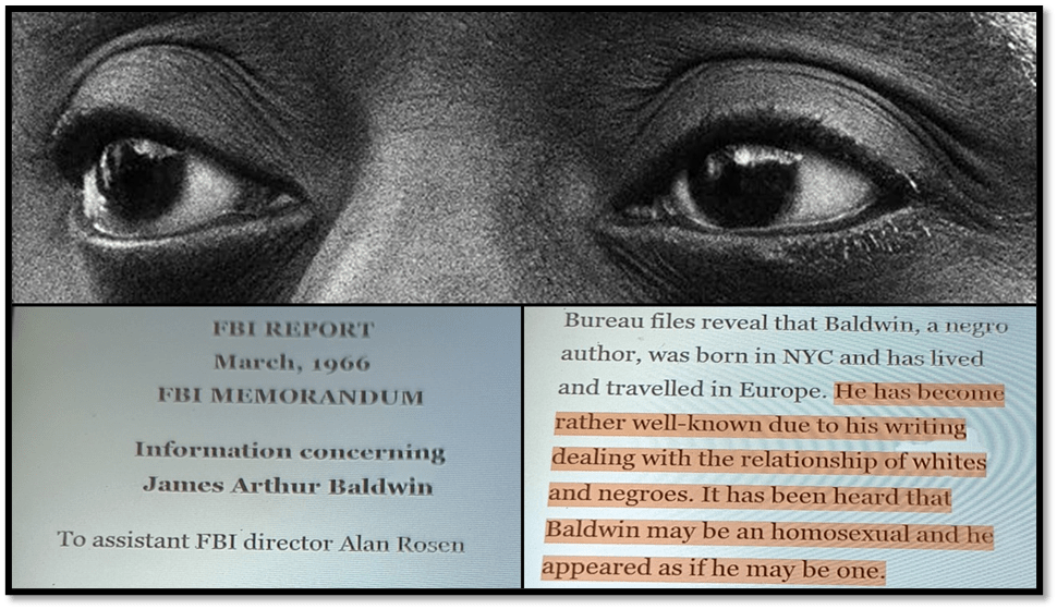 Moreover, to say “largely omits’ reference to his sexuality is to ignore the force of the fact that the film uses a caption from the FBI files on Baldwin showing that because ‘it was heard that Baldwin may be an homosexual and he appeared as if he may be one”, he was even the more so considered worthy of being listed as a ‘security risk’ and hated by Herbert Hoover, himself closeted queer but safely White, so that no-one much cared to fear him where there was indeed cause.