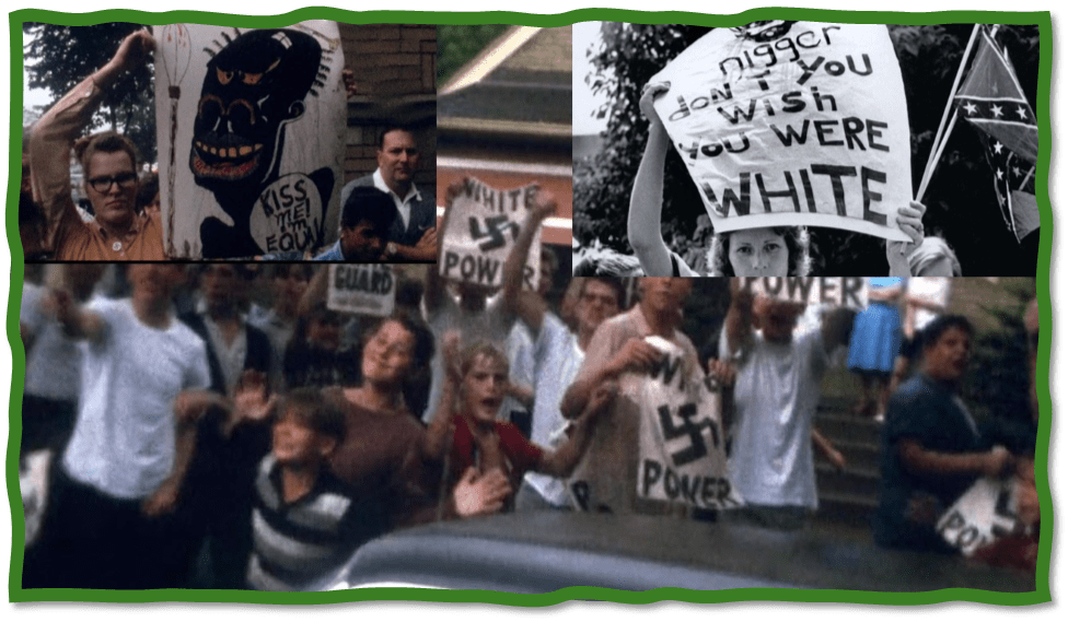 That the mission was one of the spirit not the body was plain to Baldwin, for to him, at the height of his pain at the loss of not only community leaders but personal friends, he needed to maintain, against even Malcolm X, one of the murdered men he was honouring that there was hope for unsegregated communities regardless of the colour of the skin, race or nation. Whilst this film shows the depth of racial hatred turned into action for ‘White Power’ (see the collages below) Baldwin’s rhetoric preaches – no other name suffices – that love must keep hope alive that just being White is NOT the cause of white hatred and violence to Black people.