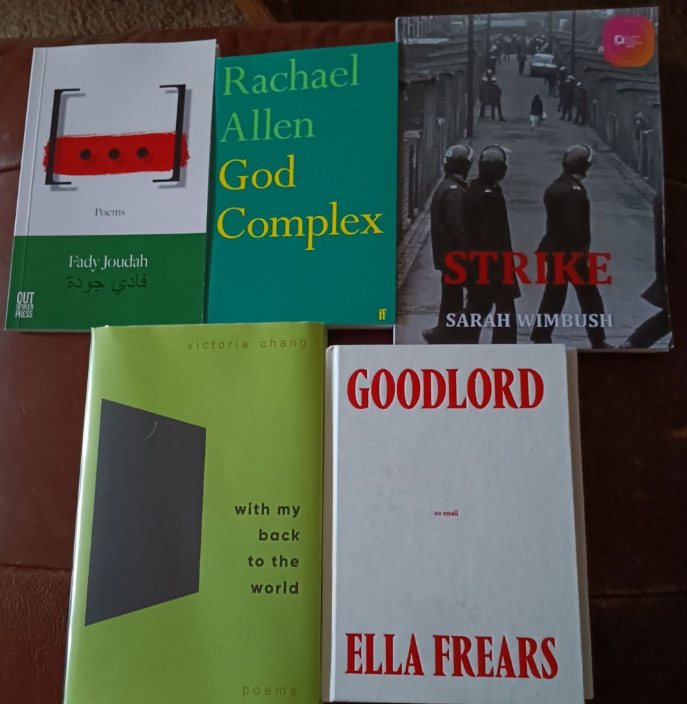 | God Complex (2024) Rachael Allen, Faber & Faber | 18 September 2024 (restarted)/ 20 Sept. 2024 | This is a powerful set of poems that can also be seen as story-telling, using a narrator whose changes of consciousness matter. Some fine poetry here | https://livesteven.com/2024/09/22/here-is-a-wasteland-of-past-aesthetics-this-is-a-blog-on-rachael-allen-2024-god-complex/?_gl=1*evo2js*_gcl_au*OTg1MjkwNDQxLjE3MjYwNDY4NDI. |