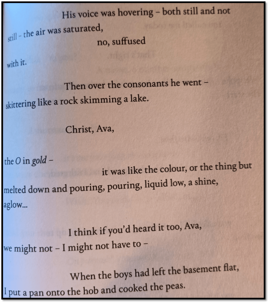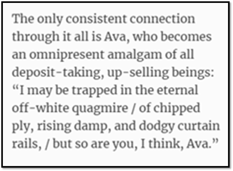 The last two quoted lines are there to illustrate the transition in the rhythms, from those of song to those of everyday prose, where flow turns into plod, an aria gives way to recitative in a seventeenth or eighteenth century operatic work. There is something both materially substantial and, simultaneously, not so in this description of falling or skimming liquidated solids or stones in mid bouncing arcs of flight. They might be both densely heavy or light in weight and shine qualitatively like light. It is quite evidently, as imagery and sound, beautiful; touched by light alliteration, repeated words and internal rhyme. The narrator seems to see it as a moment wherein the differences between herself and the letting agent of her flat, represented by Ava her allocated worker, might be resolved. But that moment of resolution is also one where the certainty of things becomes compromised, the solidity of quantitative materials to fade into their qualities to the senses and the apparently ‘settled’ nature of the world we know radically unsettled, moving when it needs to rest and yet finding no safe space to rest in.
