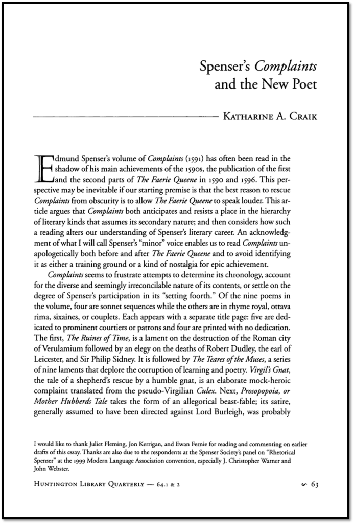 The first page of a text on Spenser: Spenser’s “Complaints” and the New Poet on JSTOR (https://www.jstor.org/stable/3817877)
