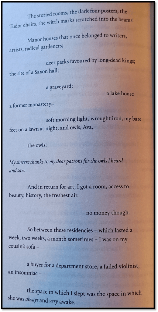 …. If you’re on your own in the countryside, it might be a more romantic setting but you’re not necessarily any safer or less lonely and there’s this overriding pressure where the trust sponsoring her residency in the book acts almost like a landlord.[6]