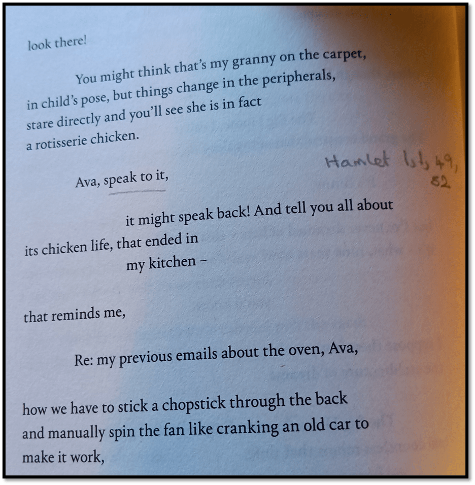 In Goodlord, this is mirrored, where the woman of the dreamt house is reduced to a thing in a man’s kitchen, that the narrator only thinks is hers – a ‘rotisserie chicken’, a natural thought where every faulty thing in your kitchen, even the oven, is owned by a male’s agent who won’t mend it:[19]
