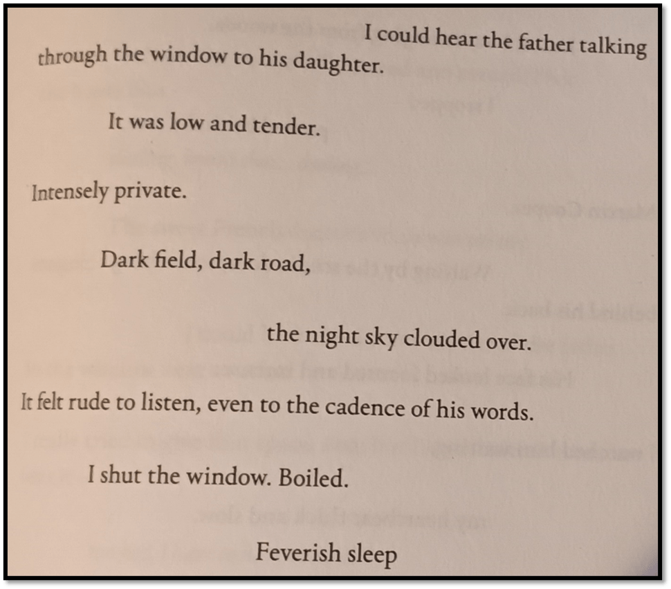 The ‘verse’ itself cooperates with the creation of a feeling of the uncanny (the unfamiliar within that thought familiar – such as the words of a Dad comforting his daughter and making her feel safe. But men in this novel rarely help to create safe space, except as an illusion to entrap, like the iconic Snake Boy who owns a ‘bar’ (of bars and boundaries more later), the Boatswain with his ‘clench’ , even weedy boys who turn bad and, of course, the awful Norman Cooper, a master of the creation of male threat. Much of the work forces on us scenes of men in groups, from different social classes, being shown for what they can be at their socialised worst – especially in bars, clubs or country pubs, but even old men alone on a train can be as gross, sexualising every aspect of their encounter with a young woman.