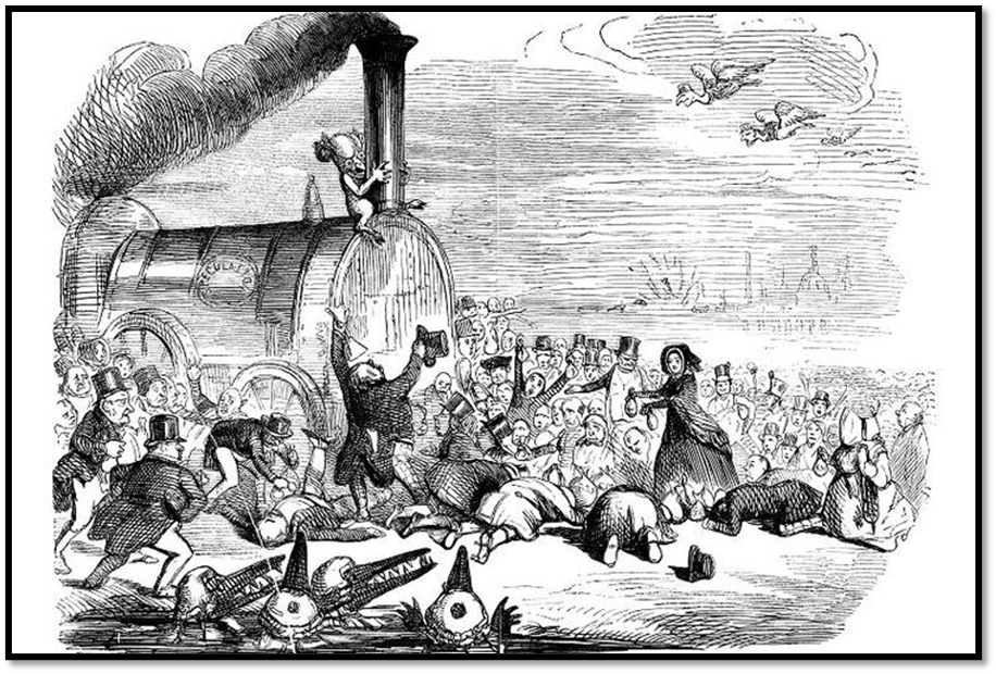 Punch pictures and satirises the ‘Railway Juggernaut of 1845’ : killing even the small capital investors who worship it.