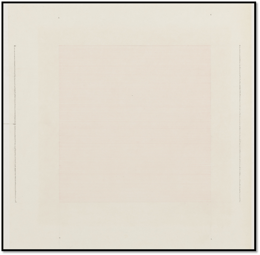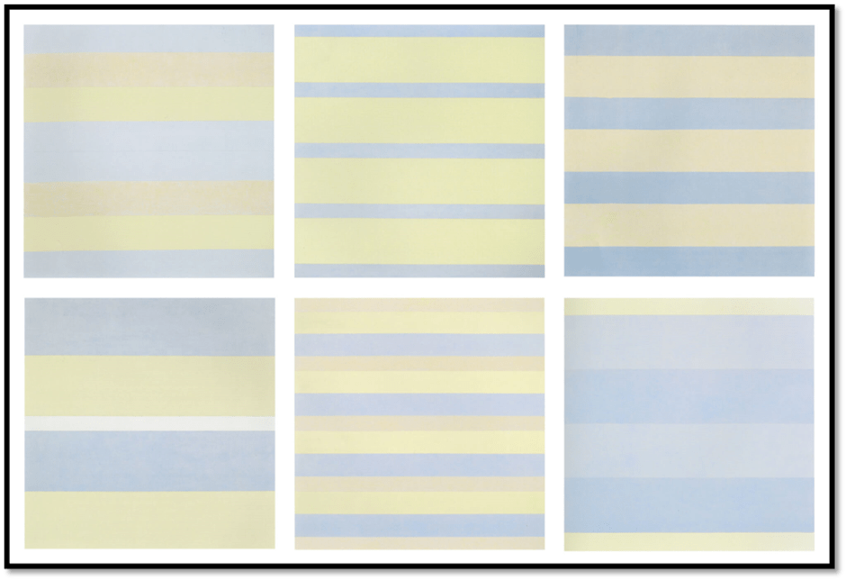 And perhaps Chang shows at other points Martin miscalculates other aspects of her line paintings. The undeniable ekphrasis in the mathematical accusation lies in the fact, as MOMA acknowledge (of My Back To The World series by Martin) that the method may appear to be merely that of identity of forms and repetitions, ‘but with time, attention, and a closer look, their many small variations reveal themselves’.[9] Gaze at the poor reproductions of that series as a whole below. Without seeing it in the flesh we would not see that the whole being of this painting of boxes, rectangles and lines of apparent monochrome sections, that the whole was created by hand with a paintbrush, that the regularities contain ‘flaws’, that are possibly of more importance than the sense of the overly controlled and regulated in abstract thought.