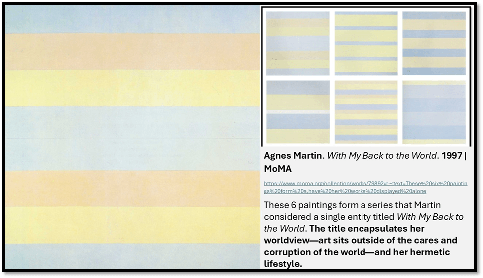 [9] MoMA (Accessed 2024) ‘Agnes Martin. With My Back to the World. 1997’ MoMA website. This page available at: https://www.moma.org/collection/works/79892#:~:text=These%20six%20paintings%20form%20a,have%20her%20works%20displayed%20alone