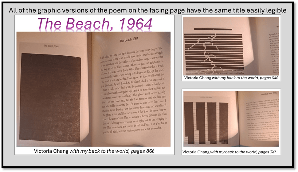 Before I leave the use of boxed containment as a theme in the Agnes Martin poems in Section I and III of the volume (although we will return to it for its different use in section II), I think it worth hearing Chang talk about this theme to Seaborn in the interview referred to above. We may think boxes constraining as well as containing but sometimes they liberate text, as when the text turns white, seeming bright against a black box in Starlight, 1962.[15] Binaries do not help us, for the variations of liberation and constraint in any form are too multiple, as is femininity and masculinity, or black and white. This is what I understand Chang to have meant below in 2020. It is about Obit, and you will notice that in these new poems she does ‘give (herself) a box to write within’. At one time that box is her parent’s coffin. :