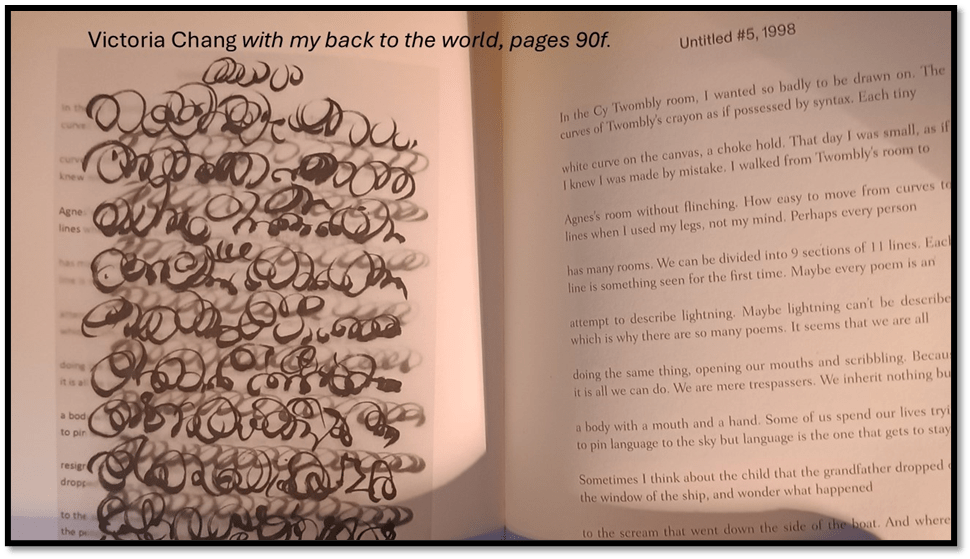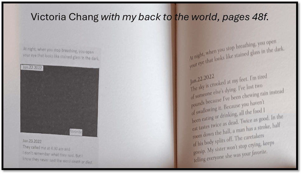 [6] Nicole Yurcaba (2024) ‘Poetry Review: Victoria Chang’s “With My Back to the World” –“What if I’ve spent my whole life wanting to be seen?”’ in Arts Fuse (online) [April 2, 2024] Available at: https://artsfuse.org/289195/poetry-review-victoria-changs-with-my-back-to-the-world-what-if-ive-spent-my-whole-life-wanting-to-be-seen/