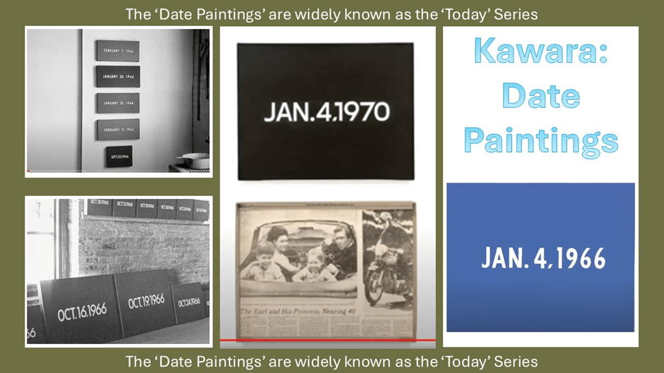 Burt before, for me sadly, leaving this volume I want to turn to the wonderful poems in Section 11, called Today and based on the Today series by a different artist, On Kawara. In fact Kawara knew them first as his ‘Date Paintings’ and he only used literal boxes to display them later in his career. Early on he needed to emphasise, despite the minimalist conceptualism of the mode of painting that he painted using several layers, that despite appearances on superficial look, whenever he used the ‘same’ colour background, repetitively and frequently, in fact the mix of the colour always differed as dis other features such as the precise visibility of dense brushstrokes. A good introduction to this work is provided by a very brief (less than 5 minutes) video from the Guggenheim Foundation by Jeffrey Weiss and colleagues. There is also at the website a transcript of the video commentaries and interviews. [17] An idea of the series appears in my collage below: