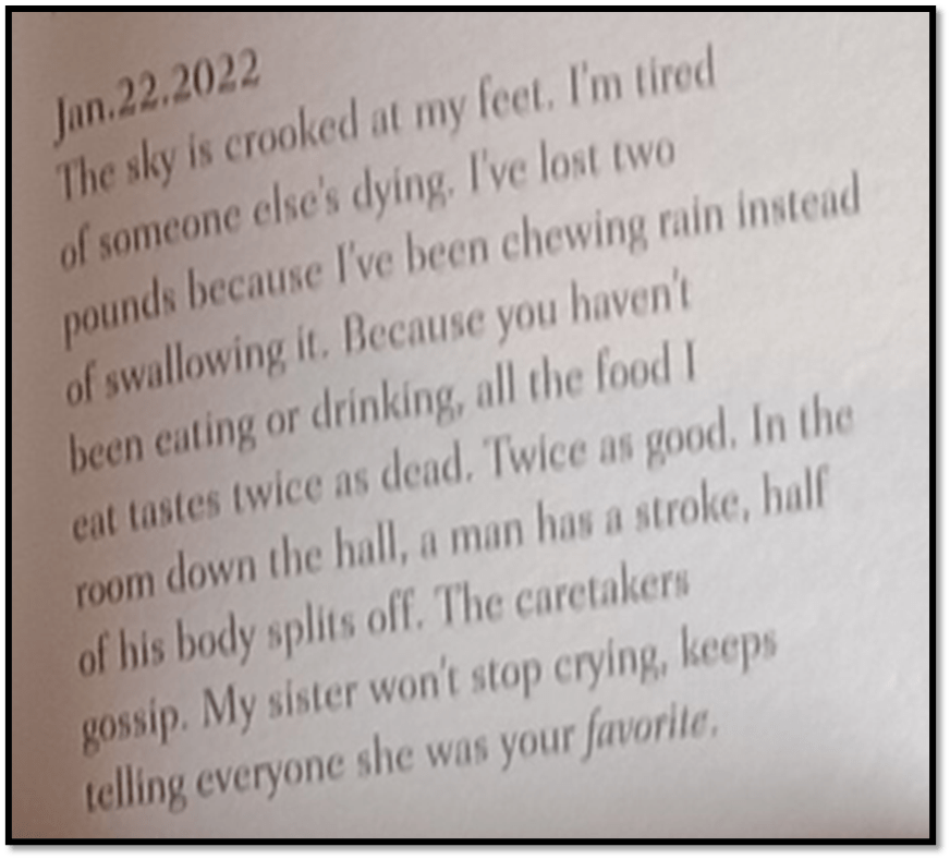 I think with these poems, as with the Martin ones, Chang wanted to both box up her record of the dying, death and mourning for her father, and to show how language presumes the presence of a felt voice. Her father’s death occurred after Obit was published, although he had been in a state of paralysis following stroke with no communication or mobility since before his wife’s death and hence, I think, the sense of retrospect in section II of this new volume. Of that ‘presence of a felt voice’ we need to add with Kathryn Savage that it, as in Obit, ‘externalises internal psychological and emotional states’ (including cognition I’d add) and, as Savage continuing puts it so beautifully: ‘What a gift to the reader, this invitation to press outwardly and inwardly at once as if both reaching and grasping simultaneously, as if holding hands’.[19]