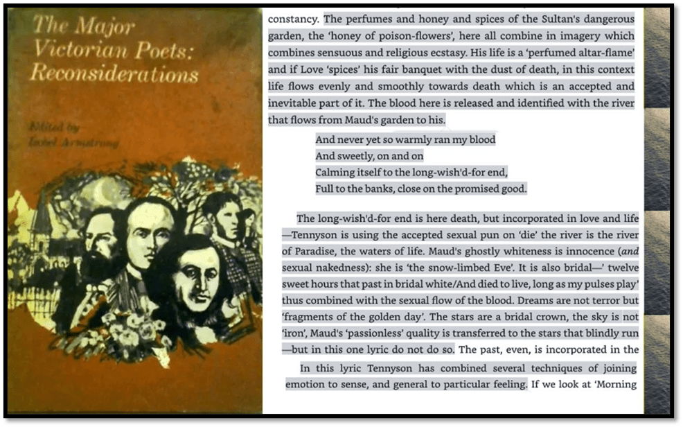 Text from A. S. Byatt (1969: 87f.) ‘The Lyric Structure of Tennyson’s Maud’ in Isobel Armstrong (Ed.) ‘The Major Victorian Poets: Reconsiderations’ Abingdon & New York, Routledge, 69 – 92.
