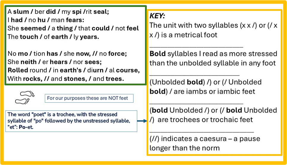 But my point is that this poem dramatises all this through poetic measures or metrics. Here is my scansion – first in text and then as a box, like the one above on Tennyson.