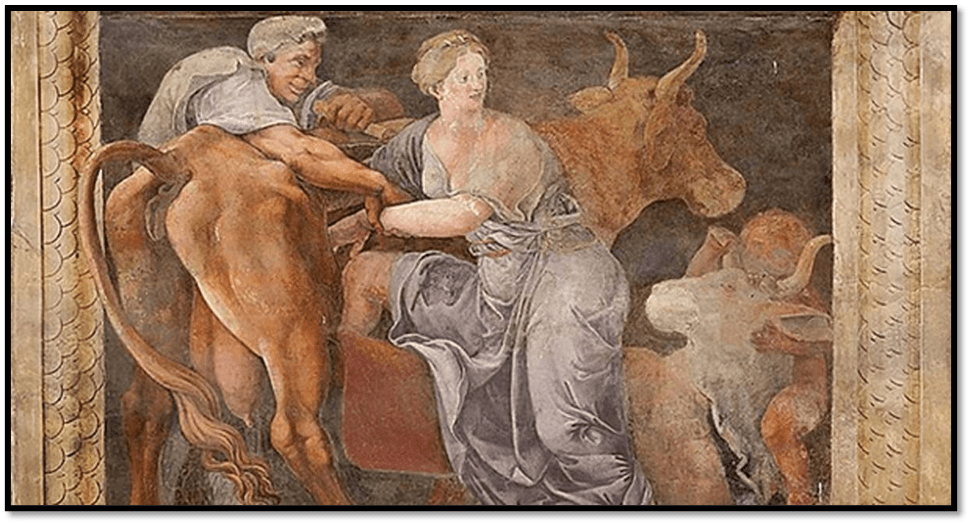 The story of female sex with a bull (indeed the one from the myth) tells how a woman might be ‘pleasured’ by a bull if you build a cunning enough and well planned model of a cow that moulds human body parts hiding inside it with those of a real cow. It is a ‘vile’ story says Minos. The engineer at this point seems to admit that this is the whole point of the story and will endure its longevity as a response to deep fantasies listeners already have inside them either misogynistically against women or in some other dark area of wishful fantasy: