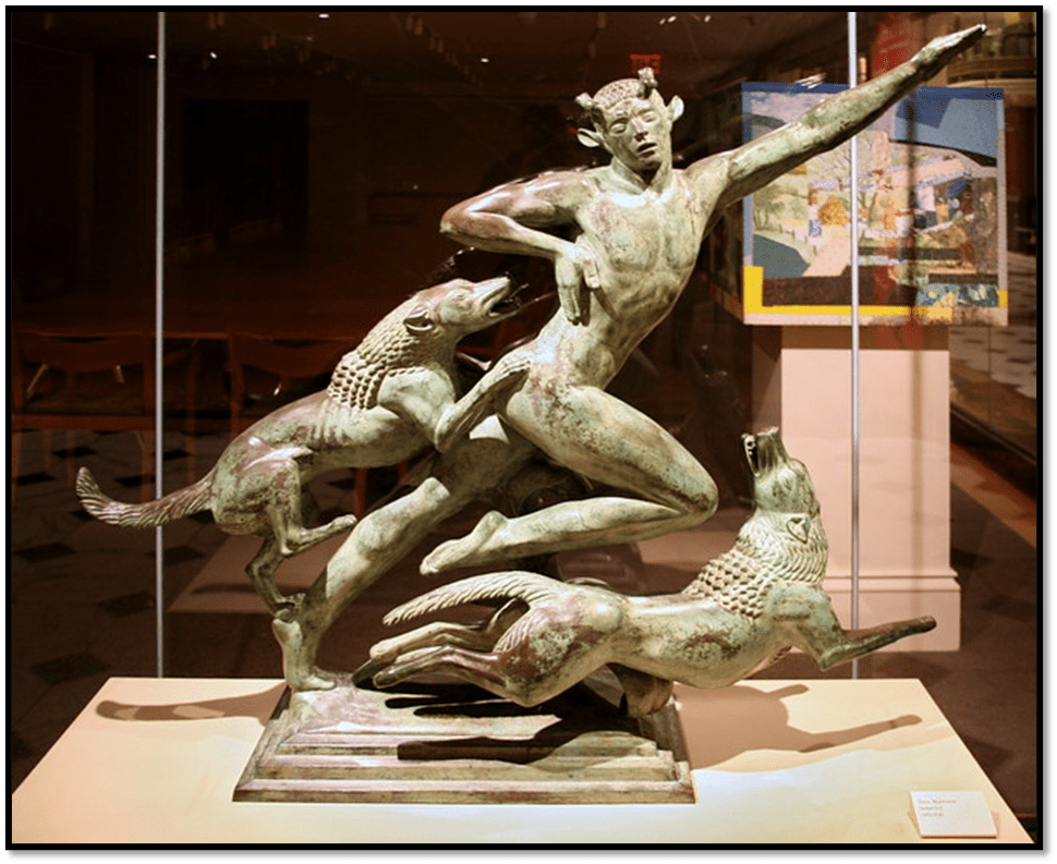 Story-telling may be performative (it has to be told and in some way enacted, if but by voice or the act of writing). However, it is also an means of engaging and entraining the nature of emotion, expressed either outwardly or inwardly or in a (possibly contradictory) mix of both. But though it is both of these (action and feeling) it must also be cognitive – it engages with thought even in its sequencing and perspective on events for instance. No stag could do this in flight and hope to escape the consequences of the delayed response in the body involved. But Actaeon is neither stag nor human but still on the boundary of being each or either – a liminal being. As Storm, his dog, sinks teeth into him he ‘cries out’: ‘“I’m human! Do you not recognise me?” But his lungs and throat and tongue can form nothing beyond that wordless, scraping bark’.[6] This last short sentence is full of irony. Even had this been spoken it is uncertain it could be understood, although Storm may have recognised the sounds of his master’s voice> However Actaeon still feels compelled to articulate it in language to his dogs as he would in an argument with a human being. Moreover though he produces a stag sound, it is no more intelligible to a dog than a human’s articulate language. The term ‘bark’ makes the point cruelly – for a stag’s ‘bark’ is not the same as that of a dog, though humans may use the same word for it.
