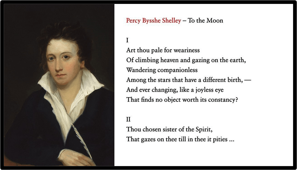 Estragon amends the quotation to add that the moon is weary specifically, ‘Of climbing heaven and gazing on the likes of us’, but that sentiment of existential disgust is not so far from the spirit of Shelley’s poem.[26]